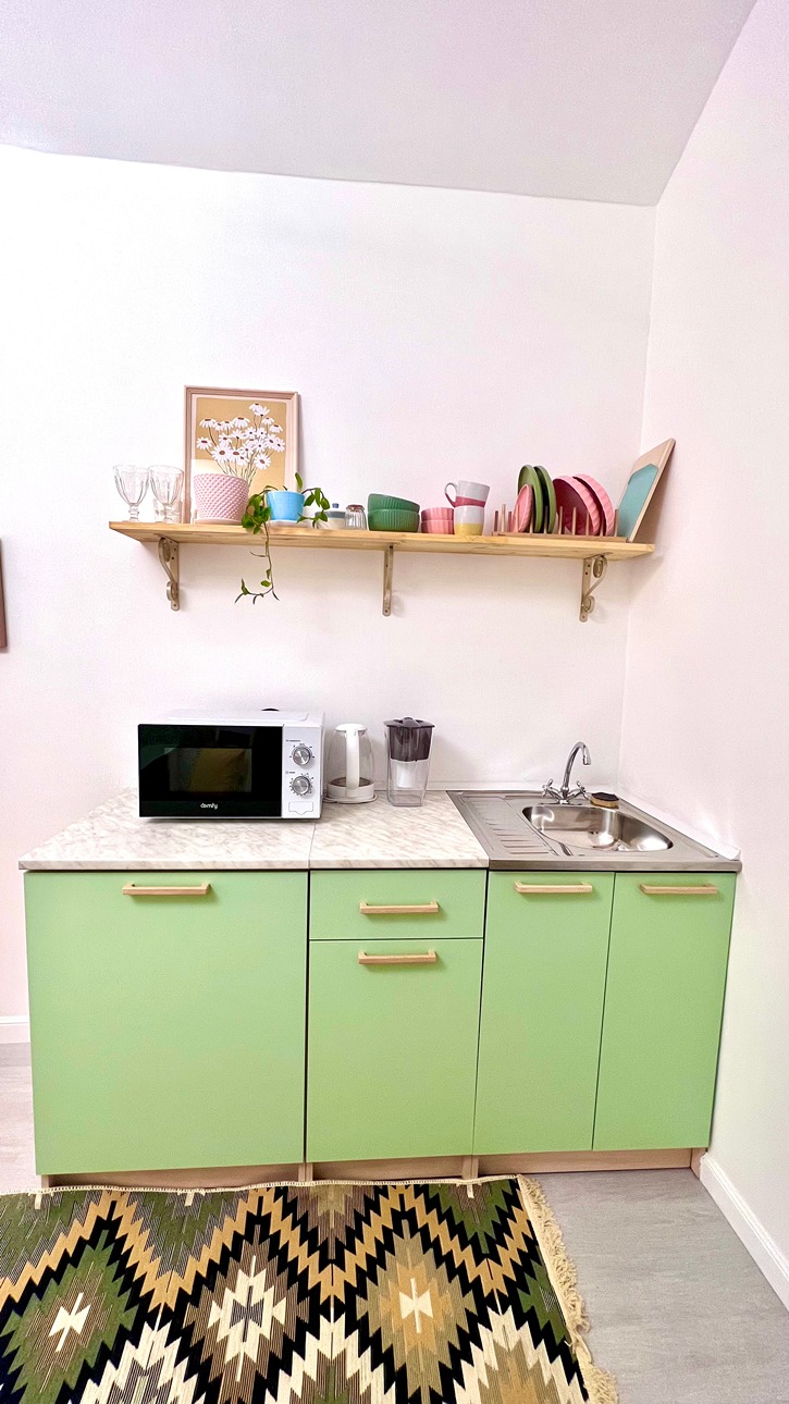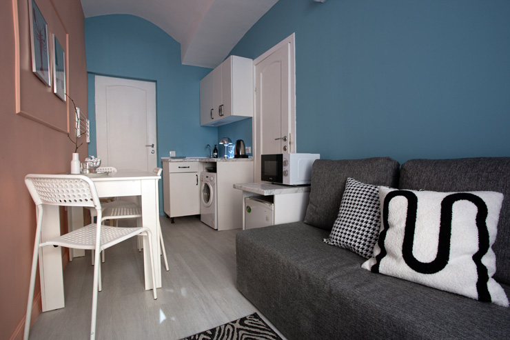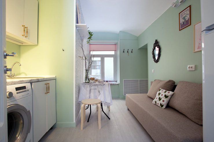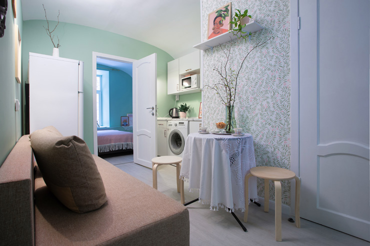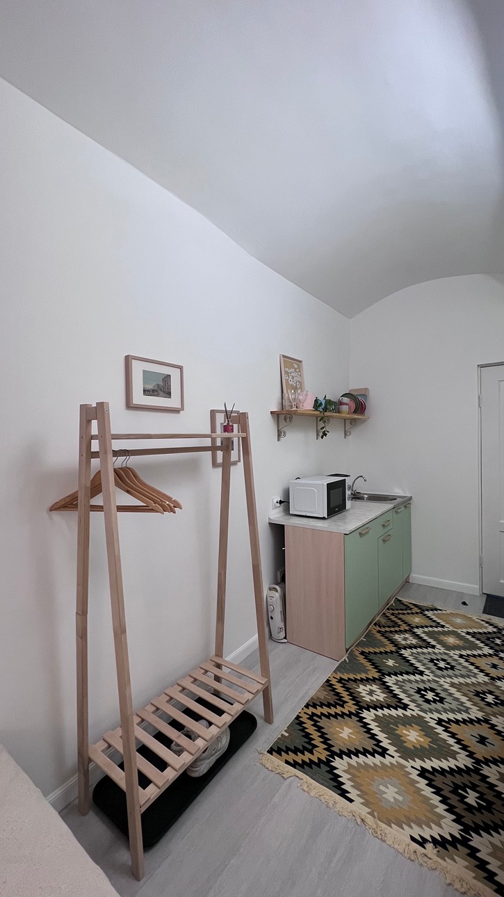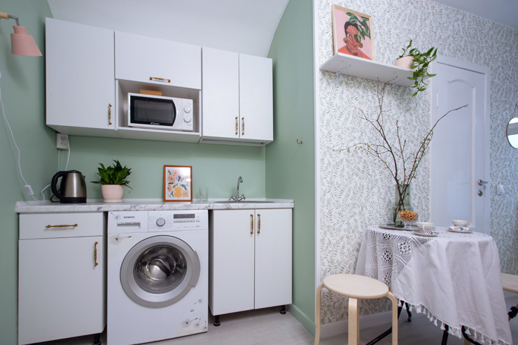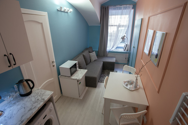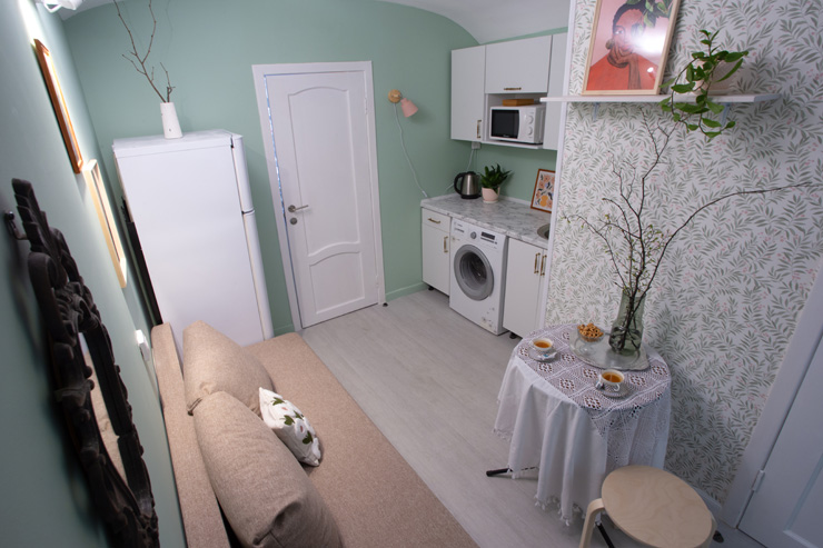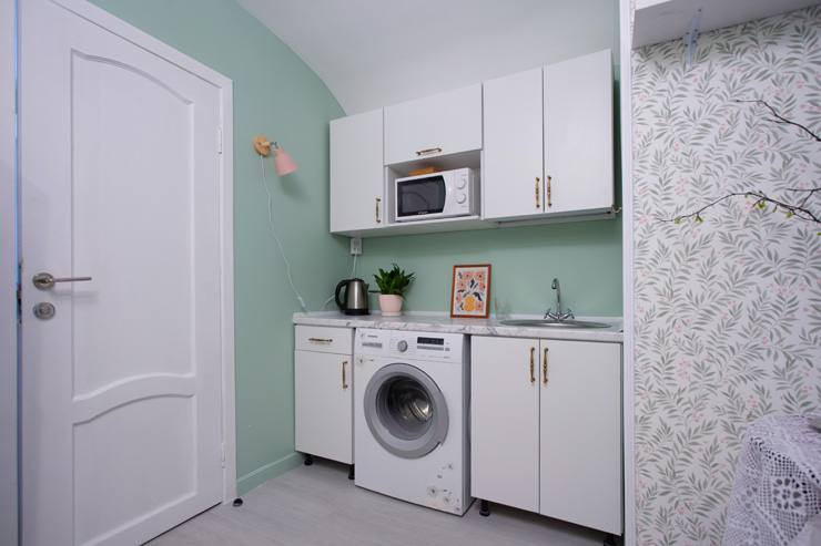 - Оборудование: микроволновая печь, мини-холодильник, набор посуды, плита индукционная, стиральная машина, телевизор, электрочайник