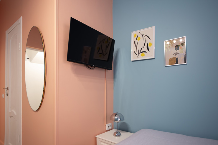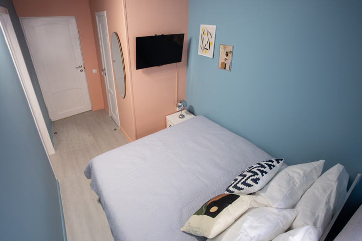 - Мебель: вешалка, диван раскладной, зеркало, кровать двуспальная, прикроватные тумбочки, стол, стулья, шкаф